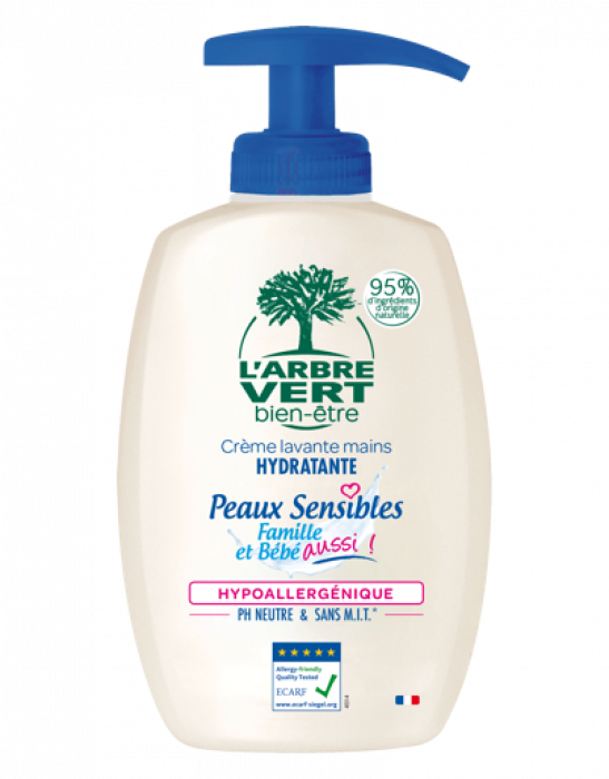 Cette crème lavante main pour peaux sensibles est certifiée par l’ECARF, la Fondation Européenne pour la Recherche sur les Allergies.