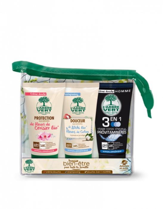 Pour plus de 2 tiers des Français, le gel douche est un produit indispensable à emporter en vacances*. Cette trousse L’ARBRE VERT Bien-être séduira donc plus d'un voyageur grâce à son petit format, pratique et léger. Elle est autorisée en avion.